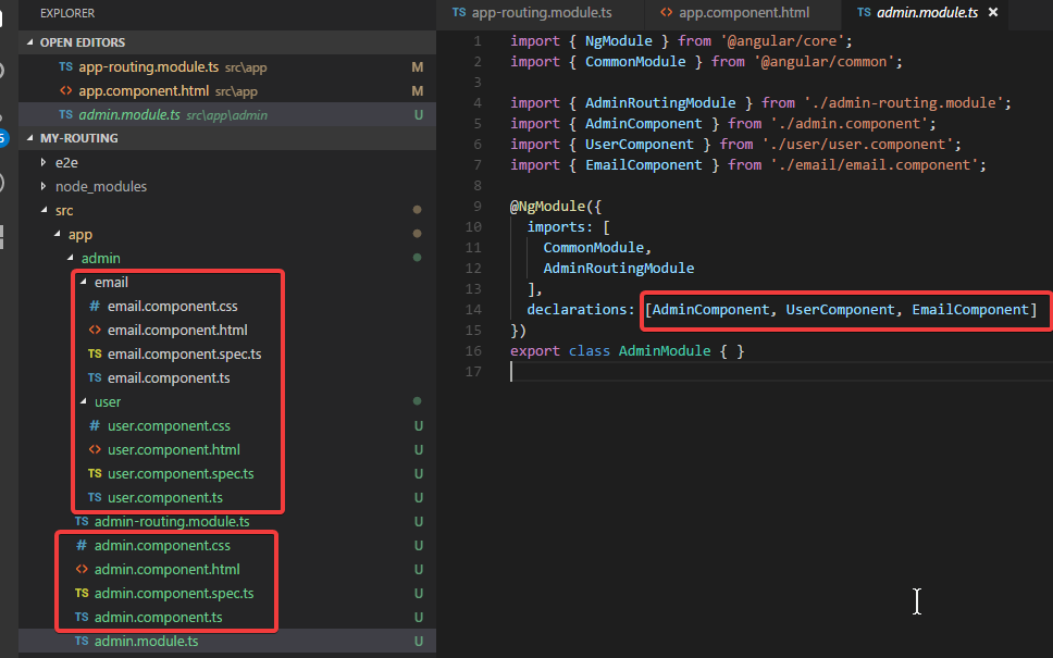 ng g c admin ng g c admin/email -m admin ng g c admin/user -m admin