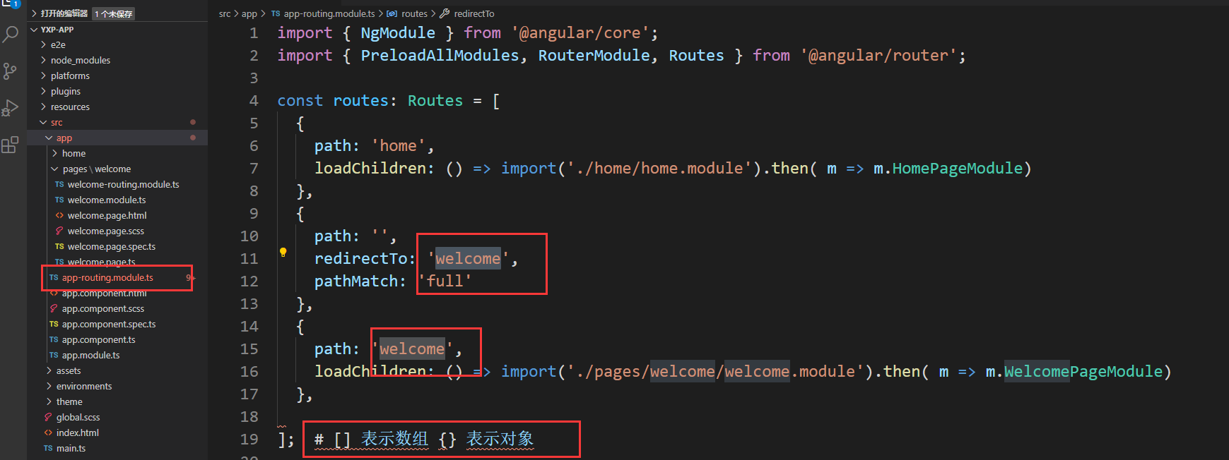 ① 修改src\app\app-welcome.module.ts路由文件。