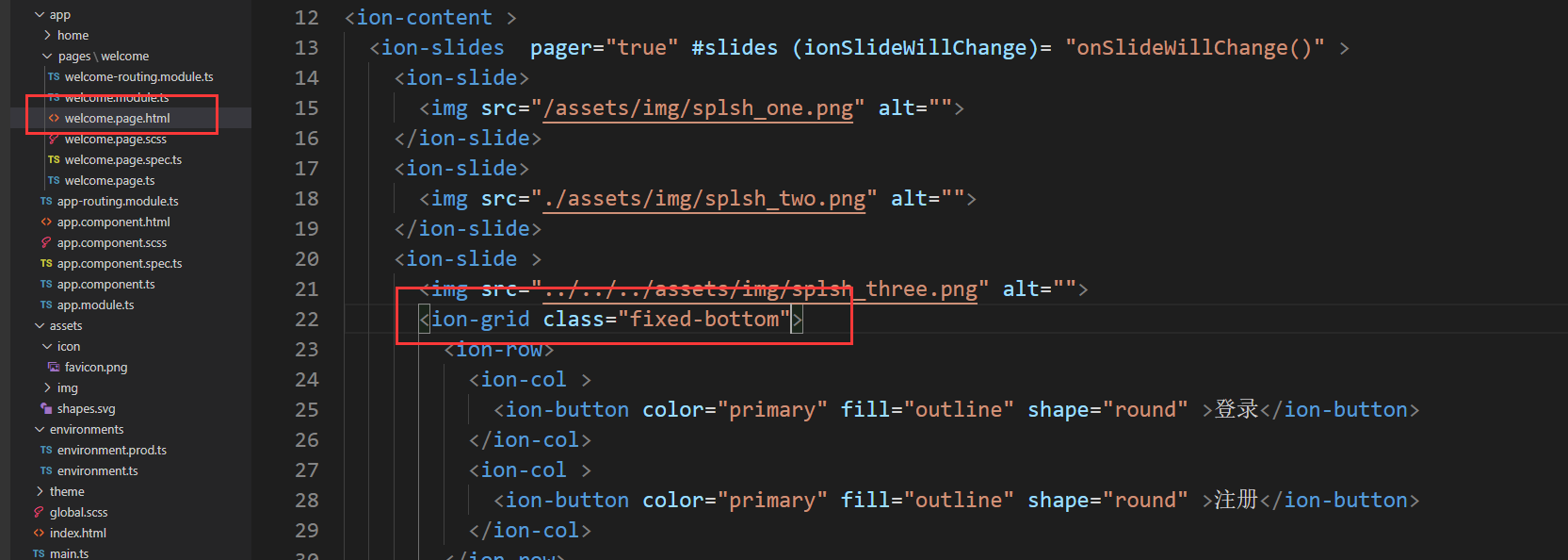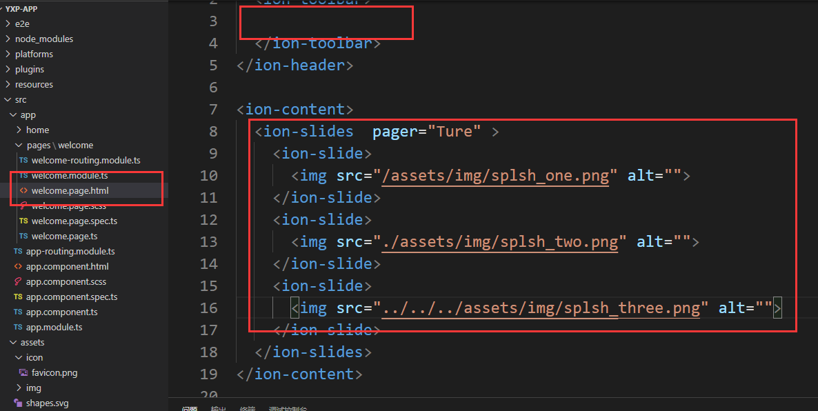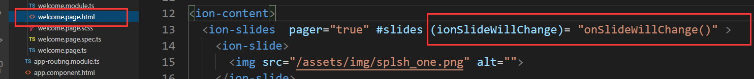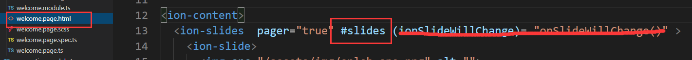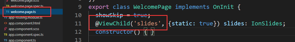 找到welcome.page.ts通过@ViewChild找到视图的子元素。static为新版的。这句话就是从视图中找到旋转木马的变量slides