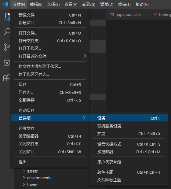 修改文件后,每次都要保存。否则切换到浏览器时无法看到程序的变化。可以通过设置VS Code来实现自动保存。 打开Visual Studio Code,在左上角依次点开 文件→首选项→设置,如下图: