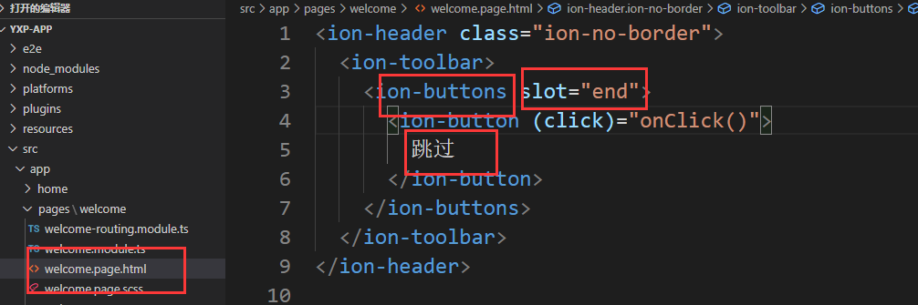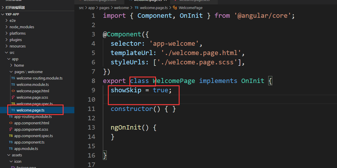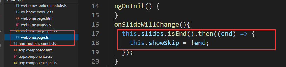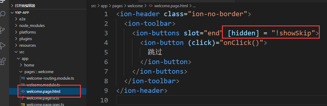在welcome.page.ts 中的类里加上public成员 showSkip.这个变量是个bool类