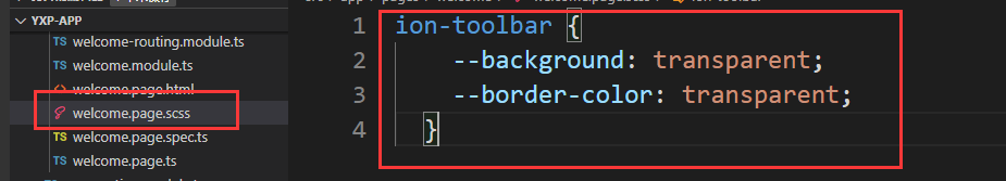 在SCSS中app-welcome是一种元素选择器,同样ion-toolbar也是元素选择器。ion-toolbar嵌套在app-welcome中表示子元素选择器。意思是在页面中作为app-welcome子元素的ion-toolbar元素才能应用–background: transparent和–border-color: transparent这两种样式。最终生成的css如下:
