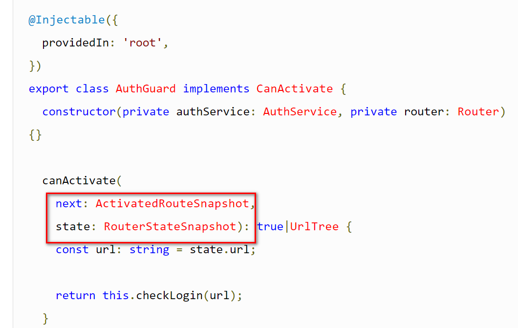 The ActivatedRouteSnapshot contains the future route that will be activated and the RouterStateSnapshot contains the future RouterState of the application, should you pass through the guard check.