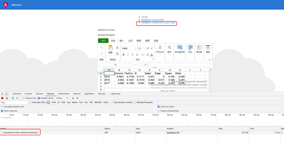 我们可以通过chrome的开发者工具的网络页标签来确认这些模块是否懒加载。点击designer component lazyload,可以看到下图的文件出现,表示准备就绪,特性模块被惰性加载成功。