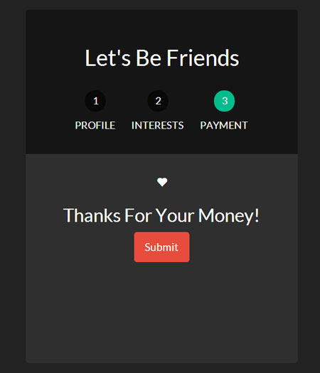 <!-- form-payment.html --> <div class="text-center"> <span class="glyphicon glyphicon-heart"></span> <h3>thanks for your money!</h3> <button type="submit" class="btn btn-danger">submit</button> </div>