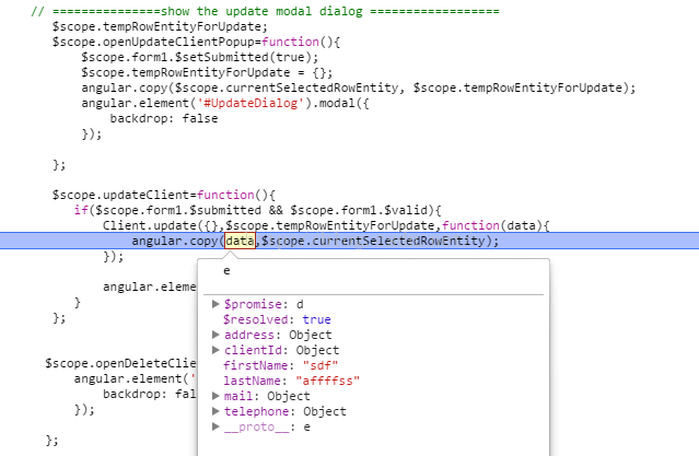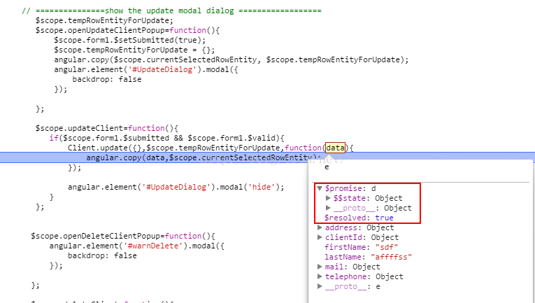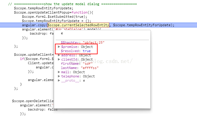 在进行下面copy时将从data返回的数据copy到当前行用来显示,这样在进行update的操作时带的数据体中就包含了$promise属性,结果就会出现上述错误导致update失败。