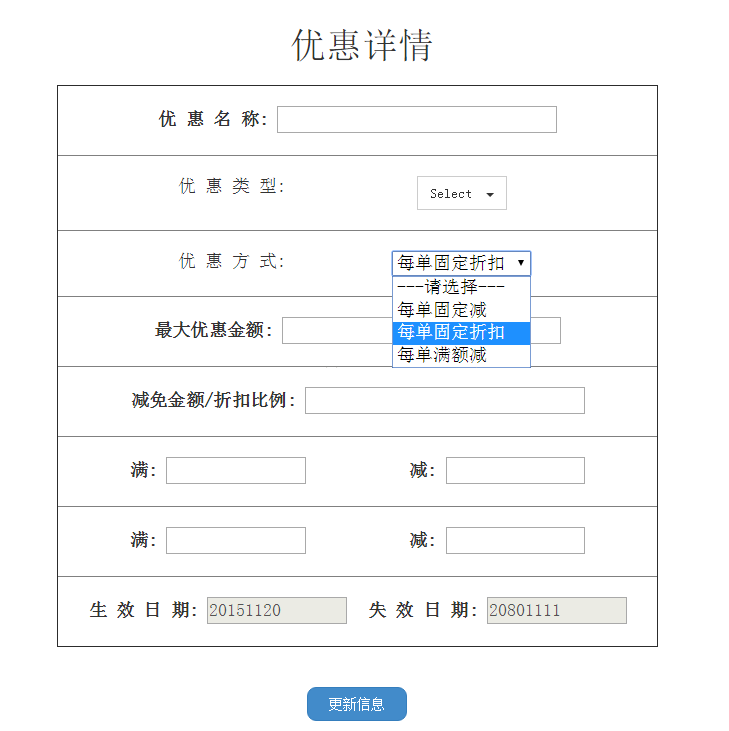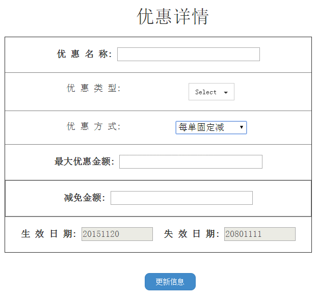 即当选择“每单固定减”时,下方只显示“减免金额”一栏;