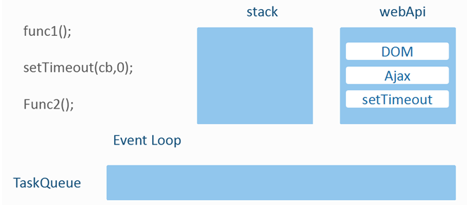 左边表示将要运行的代码,这里的stack表示javascript的运行栈,而webapi则是浏览器中提供的一些javascript的api,taskqueue表示javascript中任务队列,因为javascript是单线程的,异步任务在任务队列中执行。