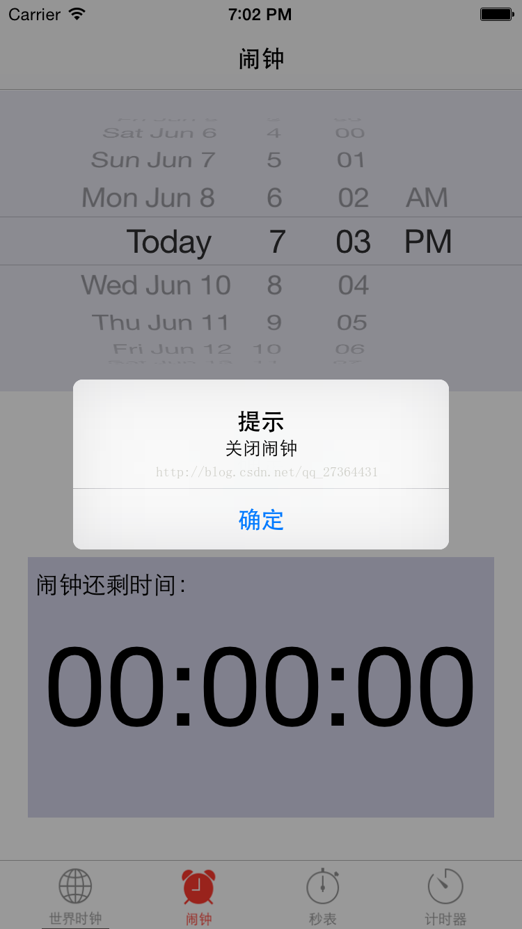 UIAlertView * alert=[[UIAlertView alloc]initWithTitle:@"提示" message:@"关闭闹钟" delegate:nil cancelButtonTitle:@"确定" otherButtonTitles:nil];