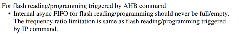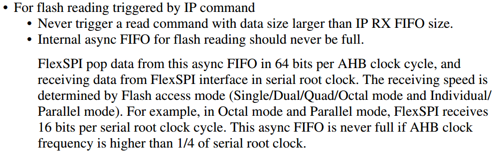 FlexSPI以64Bits每AHB时钟周期的方式弹出数据,并以serial root clock 从FlexSPI接口接收数据。接收速度由闪存访问模式(单/双/四/八进制模式和单独/并行模式)决定。例如,在八进制模式和并行模式下,FlexSPI每个串行根时钟周期接收16位。如果AHB时钟频率高于串行根时钟的1/4,这个异步FIFO永远不会满。
