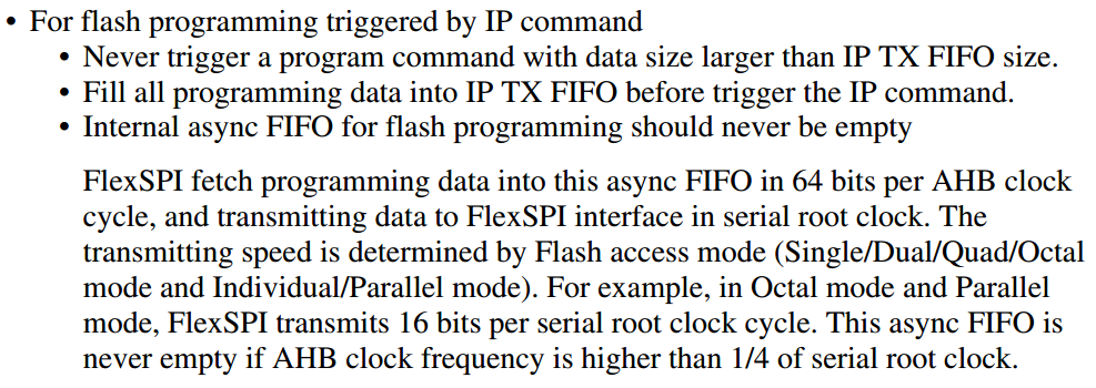 在FlexSPI中触发AHB程序命令之前,所有的编程数据都应该被缓冲到AHB TX缓冲区中。(提前准备好数据,写入开始后不能改变)