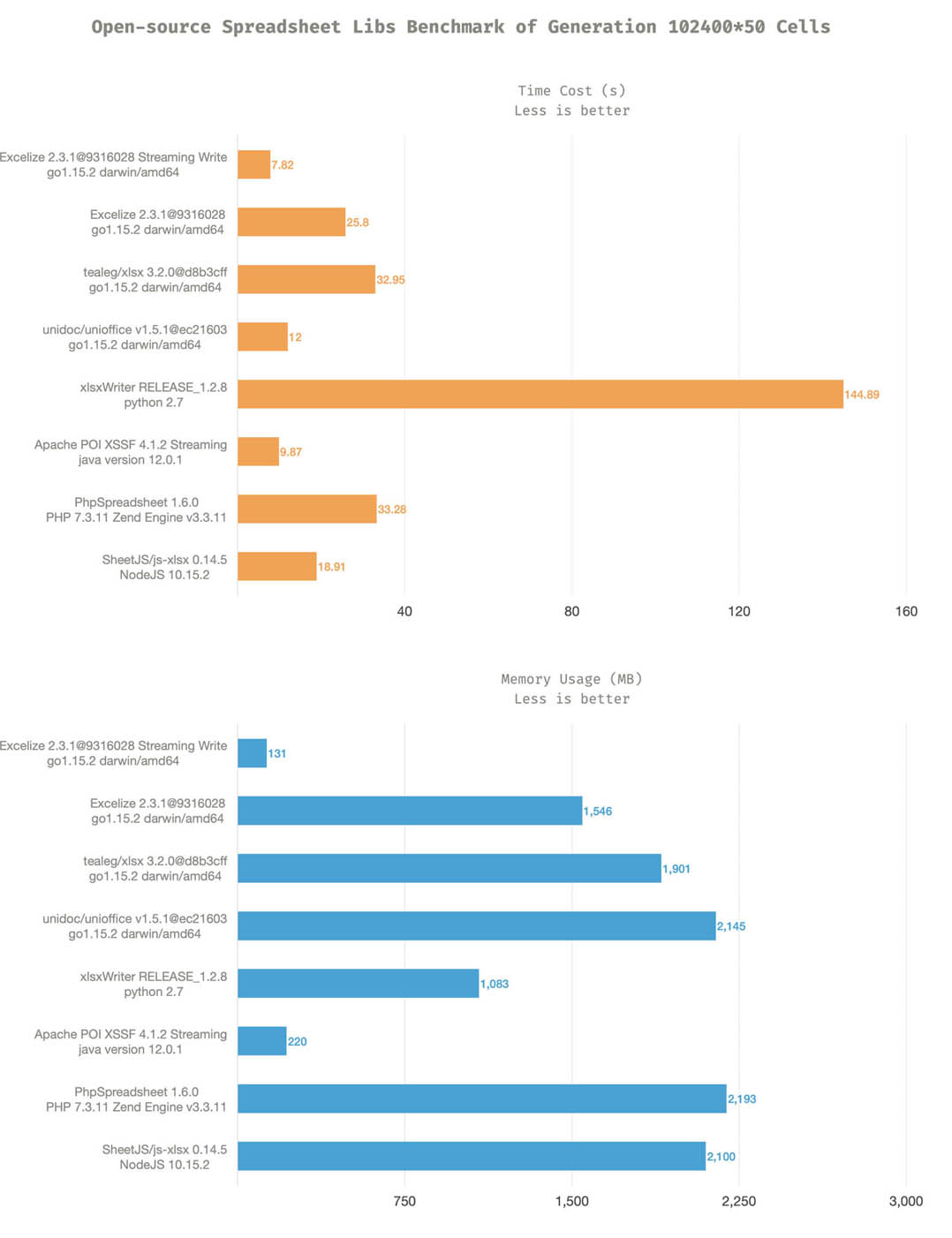 下图是一些主要的开源 excel 库在生成 12800*50 纯文本矩阵时的性能对比(os: macos mojave version 10.14.4, cpu: 3.4 ghz intel core i5, ram: 16 gb 2400 mhz ddr4, hdd: 1 tb),包括 go、python、java、php 和 nodejs。