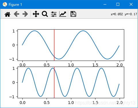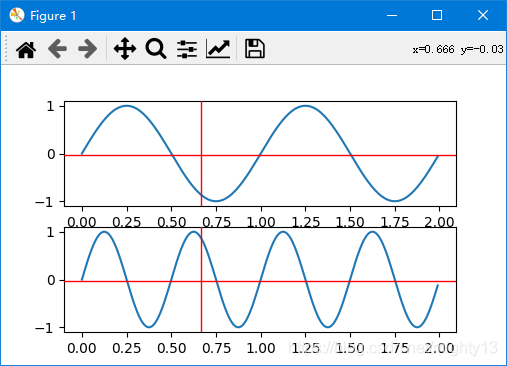 import numpy as np import matplotlib.pyplot as plt from matplotlib.widgets import multicursor t = np.arange(0.0, 2.0, 0.01) s1 = np.sin(2*np.pi*t) s2 = np.sin(4*np.pi*t) fig, (ax1, ax2) = plt.subplots(2, sharex=true) ax1.plot(t, s1) ax2.plot(t, s2) multi = multicursor(fig.canvas, (ax1, ax2), color='r', lw=1) plt.show()