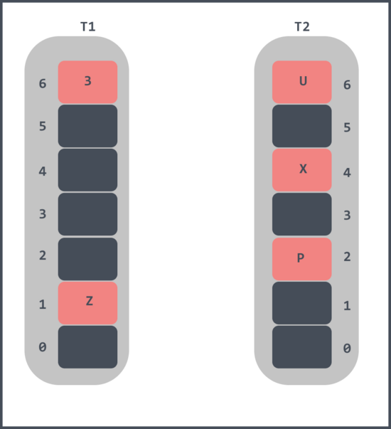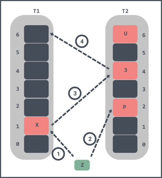 - 随机将 t1 中的槽位1中的元素 x 踢出,x 的 t2 对应的槽位4已经被元素 3 占了;