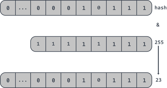 如一个布谷鸟过滤器中数组的长度2^8即256,那么取 hash 值的最后 n 位即: hash & 255 这样就可以得到最终的位置信息。如下最后得到位置信息是 23 :