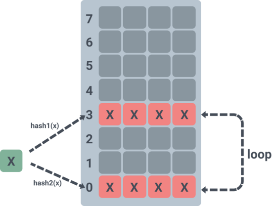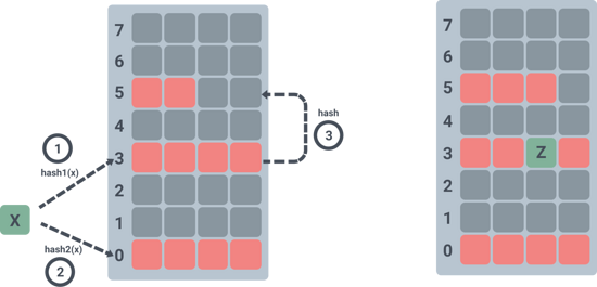 上图展示了元素 x 在插入到 hash 表的时候,hash 两次发现对应的槽位 0 和 3 都已经满了,那么随机抢占了槽位 3 其中一个元素,被抢占的元素重新 hash 之后插入到槽位 5 的第三个位置上。