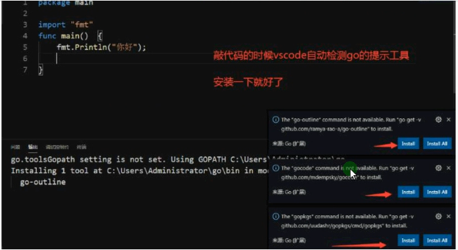 4、我们将上面无法安装成功的包,手动安装,由于每个人可能安装成功的不一样,可以全部执行,将目录切换到%GOPATH%下执行下面代码