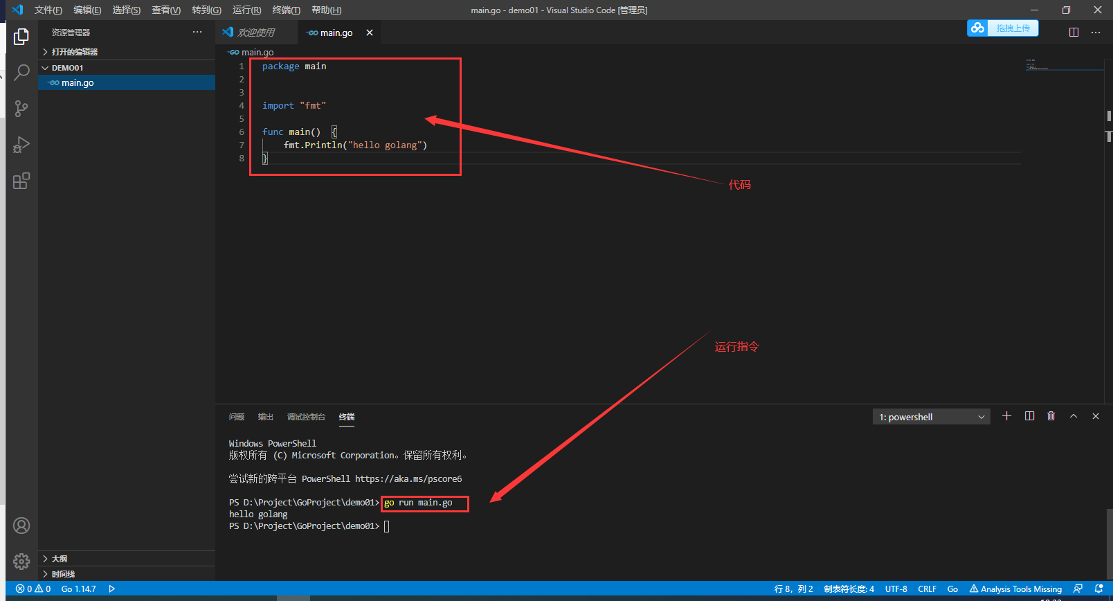 菜单栏~菜单 ~打开文件夹 ~ 选择项目根目录在根目录下,创建go文件