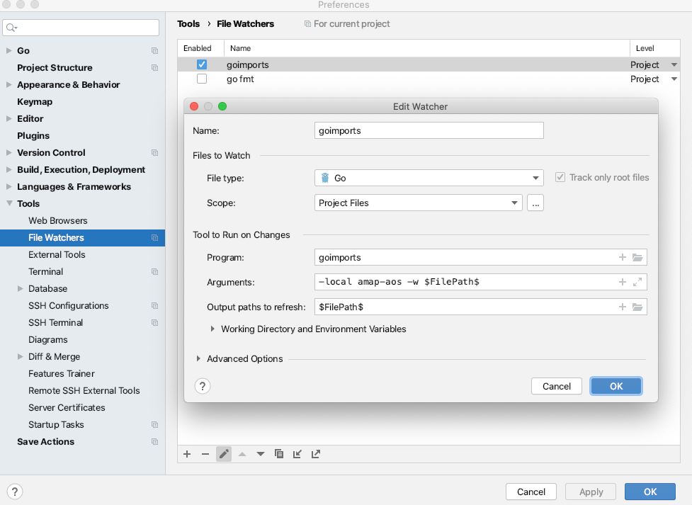 2.设置goimports 格式化代码。preferences -> tools -> file watchers。添加goimports 然后设置本地包单独分组参数。