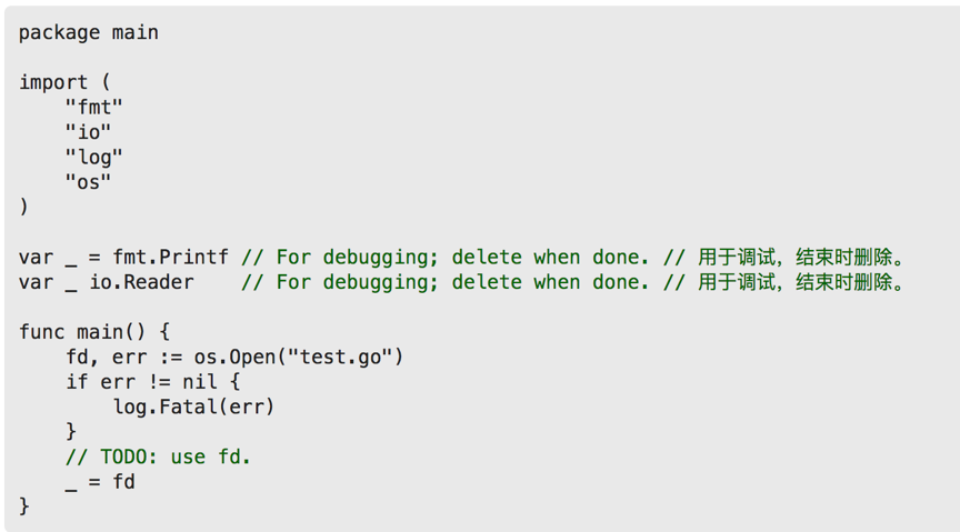 对于暂未使用的导入和变量,可用空白标志符防止编译报错,如图11.1: