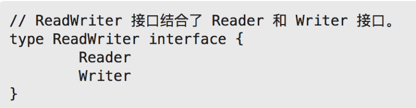 go没有子类的概念,但能通过内嵌的方式实现类似的功能(聚合转发的方式)。接口内嵌如下图12.1,readwriter接口会拥有reader和writer接口中的方法。