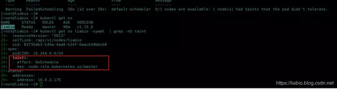 查看master节点默认加了污点,一般不允许pod调度到master节点:
