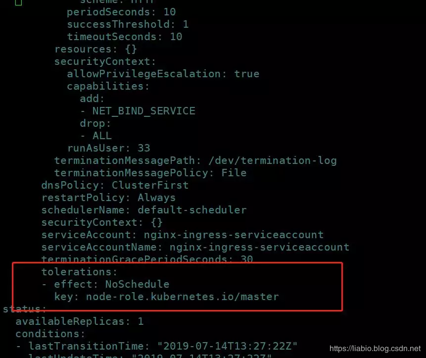 如果k8s集群只有一个节点,可以在pod的spec下设置容忍该污点: