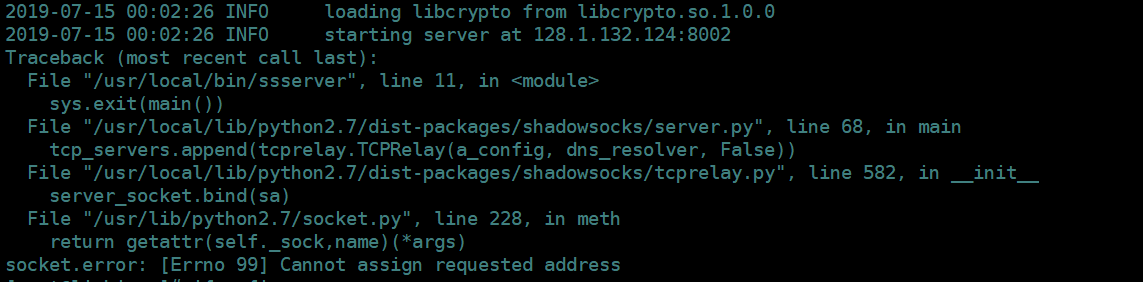 file "/usr/local/lib/python2.7/dist-packages/shadowsocks/server.py", line 68, in main