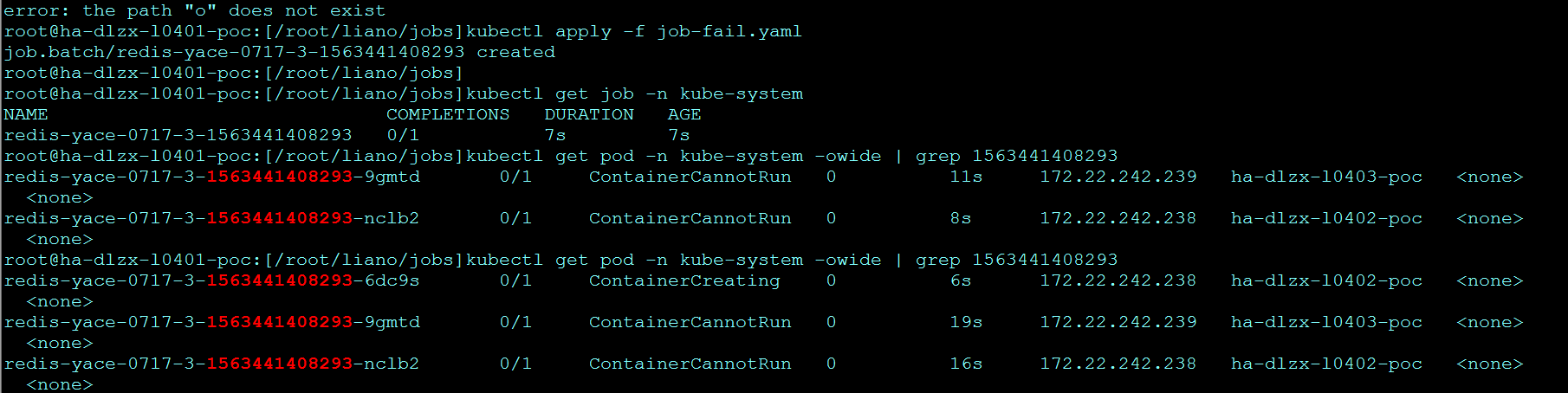 运行 job 并查看状态,可以看到never策略的job,pod失败后,重新创建: