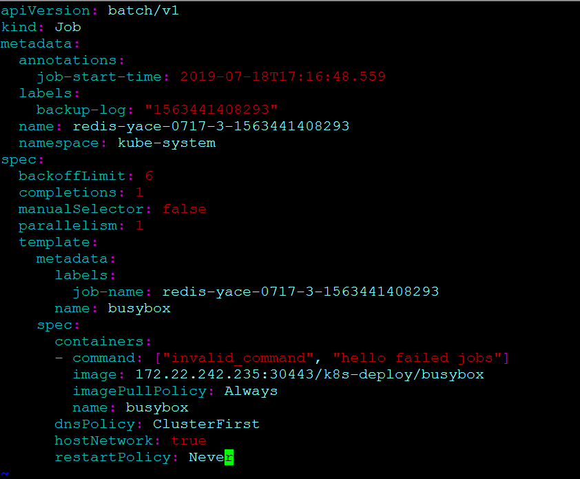 如果将 restartpolicy 设置为 never 会怎么样?下面我们实践一下,修改job-fail.yaml后重新启动。