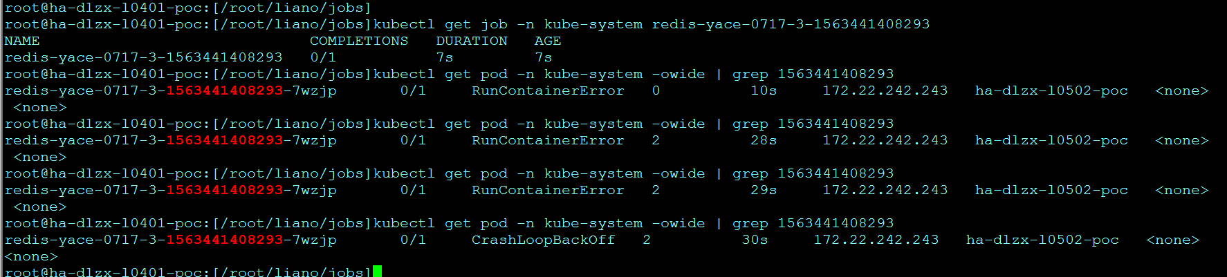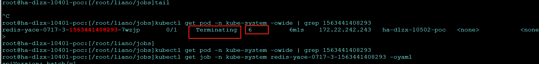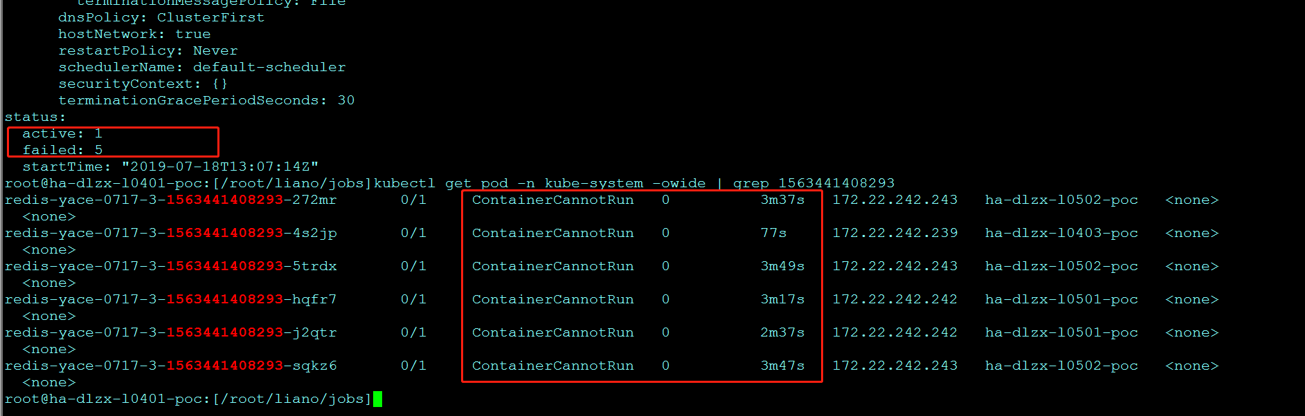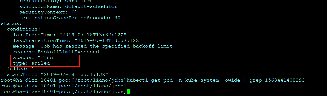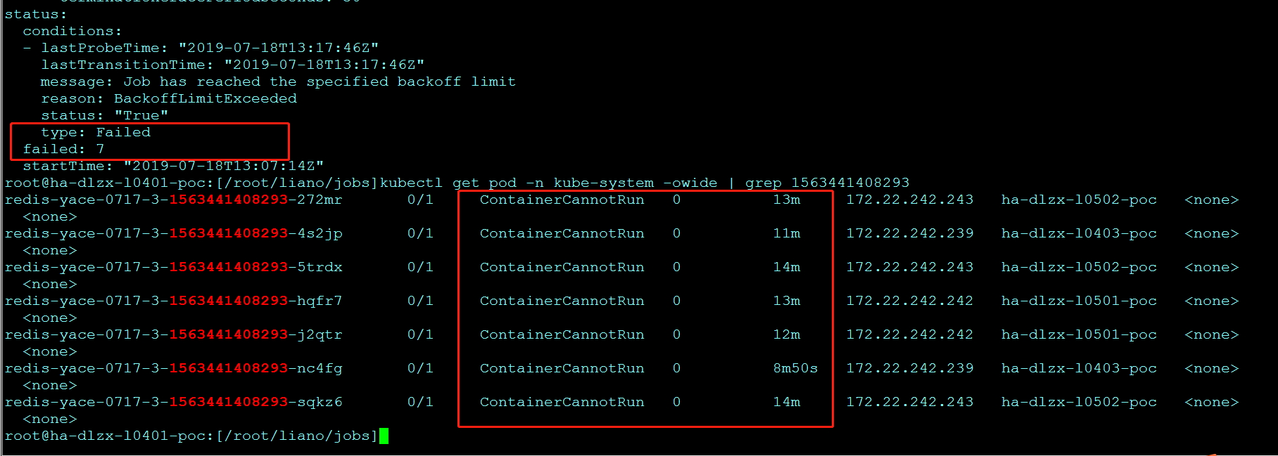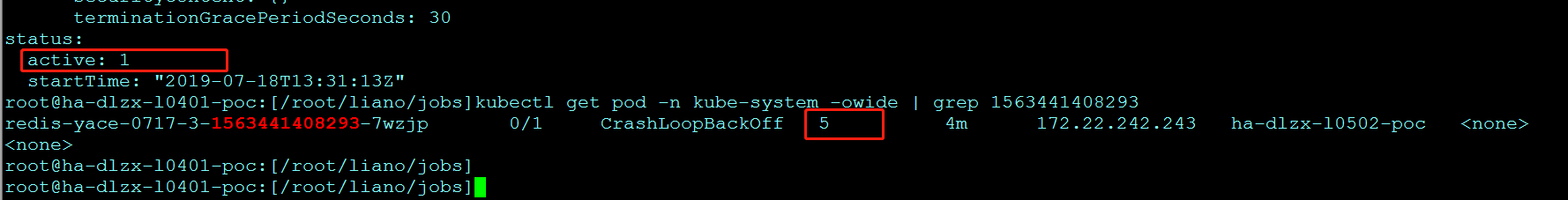 原因是:当第一个 pod 启动时,容器失败退出,根据 restartpolicy: never,此失败容器不会被重启,但 job desired 的 pod 是 1,目前 successful 为 0,不满足,所以 job controller 会启动新的 pod,直到 successful 为 1。对于我们这个例子,successful 永远也到不了 1,所以 job controller 会一直创建新的 pod,直到设置的数量,失败后pod不会自动被删除,为了终止这个行为,只能删除 job,pod也会被同时删掉。