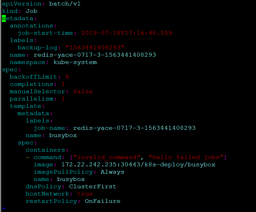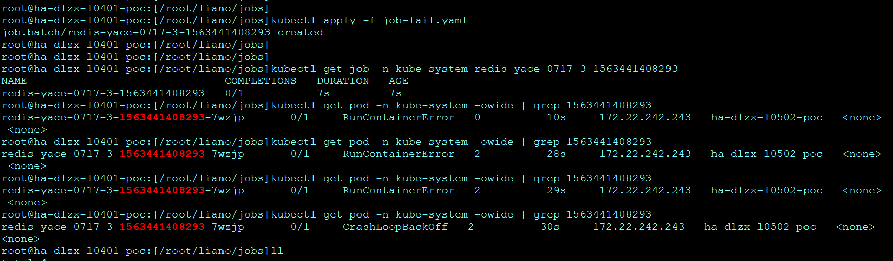 如果将 restartpolicy 设置为 onfailure 会怎么样?下面我们实践一下,修改job-fail.yaml后重新启动。