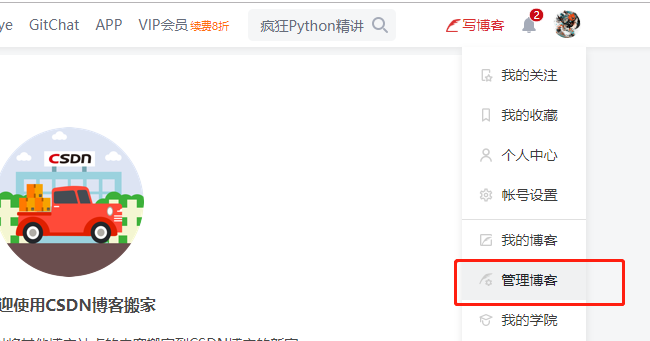 鼠标放到头像处,点击下拉框中的【管理博客】>> 点击侧栏的【博客模块管理】