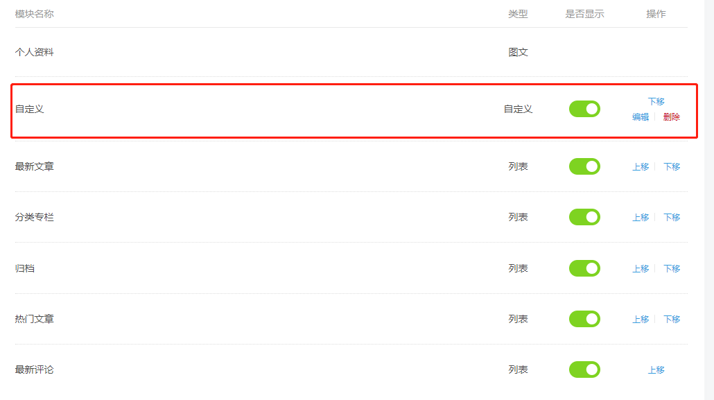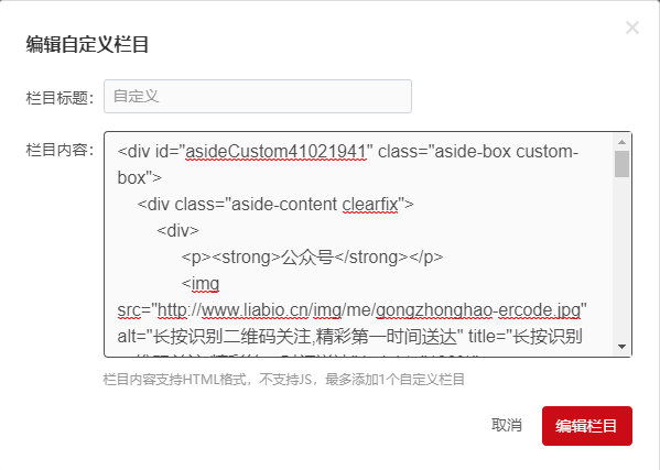 只能添加一条自定义栏目,栏目内容支持html,可以自由发挥: