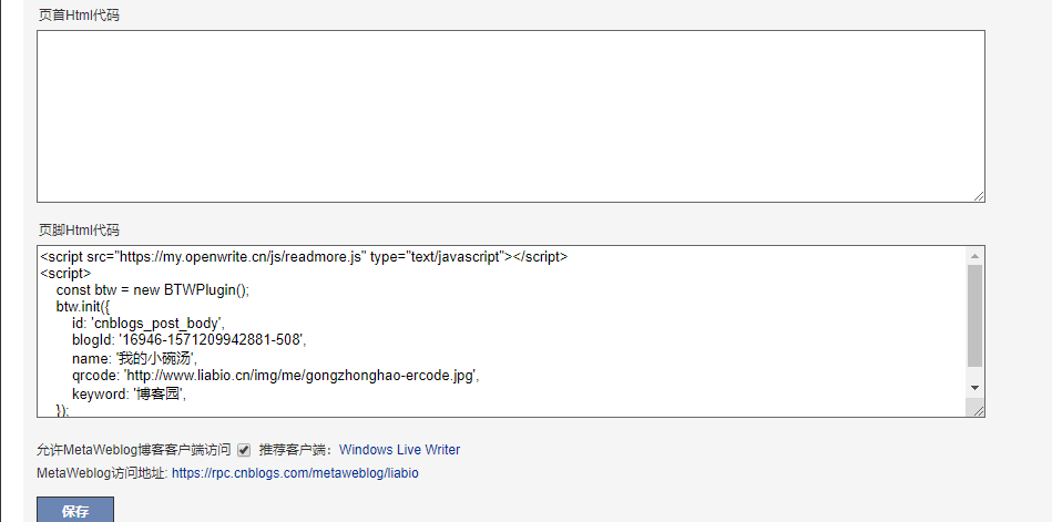 打开博客园,管理 / 设置页面,在最下方 页脚html代码 中添加第二步中复制的代码,修改代码中的 id 为 cnblogs_post_body 点击保存。