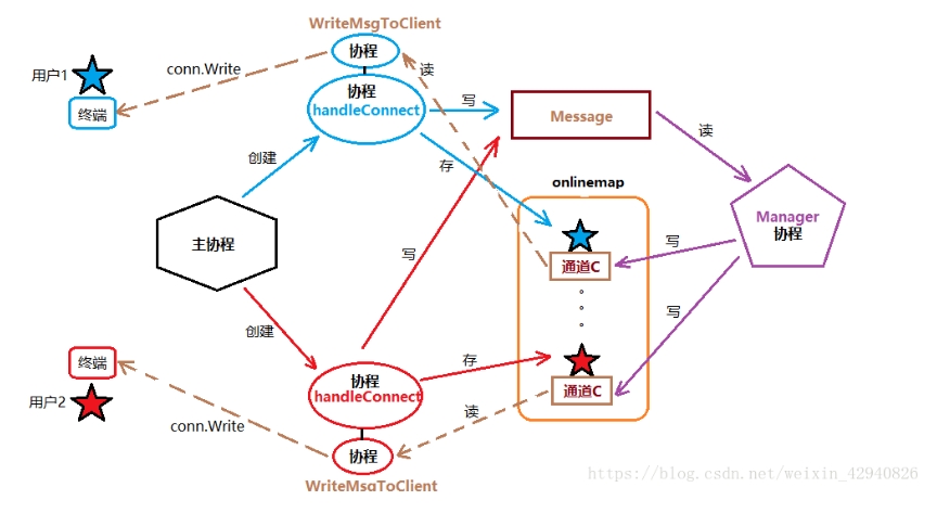 在开始项目前,我们需要理解贯穿这整个项目的两个重要变量,若能理解这两个变量的使用,那么并发聊天室项目会变得手到擒来。第一个是onlinemap全局map,第二个是message全局channel。