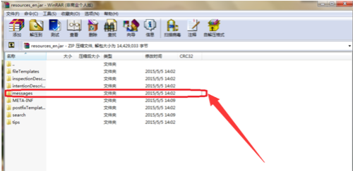 3、双击打开resources_cn.jar(注意是打开而不是解压出来),将下载的汉化包zh_CN目录下的所有文件拖到刚才打开的resources_cn.jar文件内的messages目录中,并保存