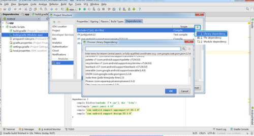 1、?在android studio中打开file>>project structure在弹出对选项卡中选择app模块中的dependcies选项。在选项卡中选择边栏上的加号。