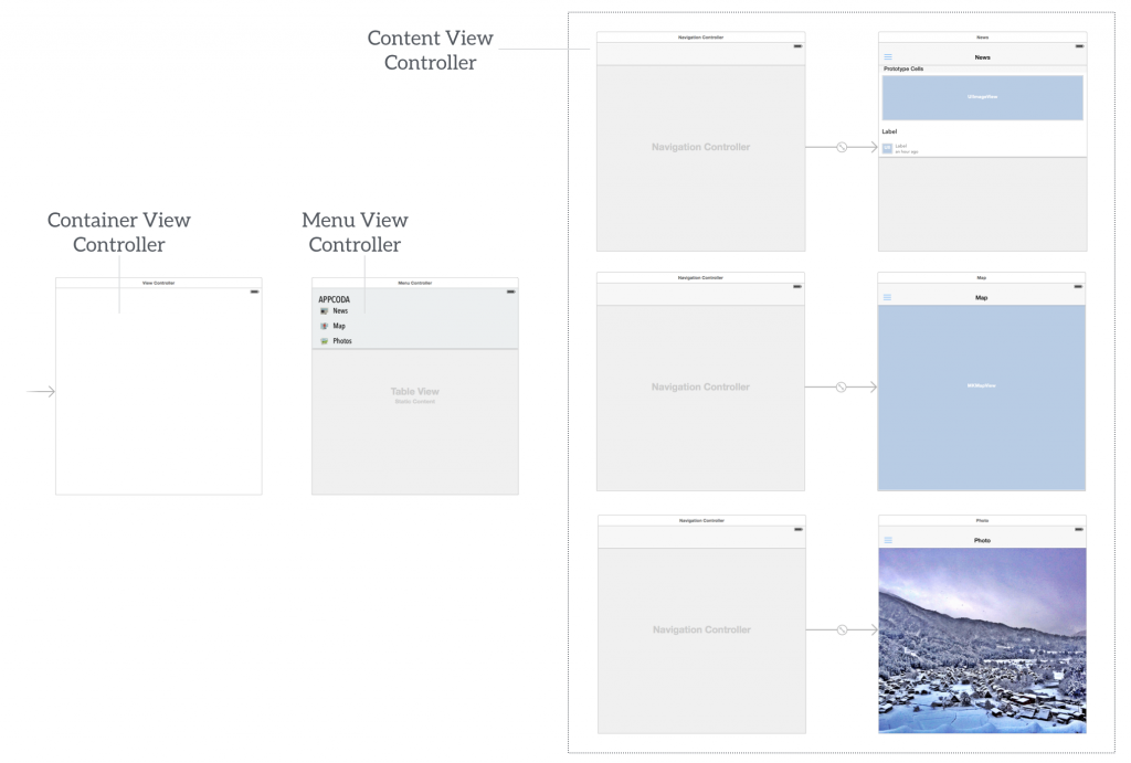 想要使用 SWRevealViewController 来实现侧滑菜单,你需要有一个控制器做容器,用它来存放菜单控制器和一组内容控制器。我已经为你创建好了菜单控制器,它是一个静态的列表视图,有三行内容。对应的有三个内容控制器来分别展示新闻、地图和照片。鉴于这个 Demo 只是演示的目的,内容控制器里放置的都是静态内容。所有用到的图标和图片资源都已经包含在了工程里面(注:在这里需要感谢Pixeden网站提供的免费图标)。