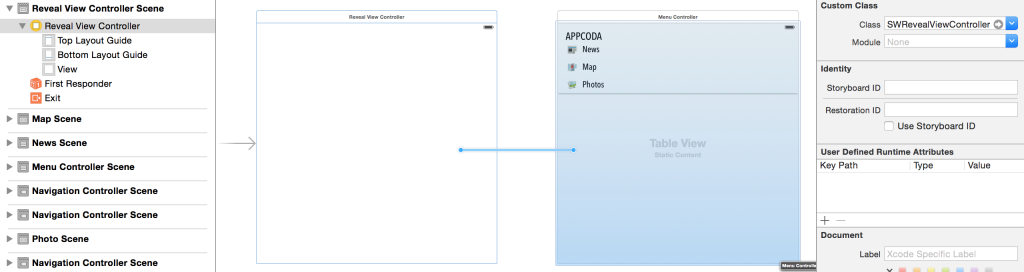 SWRevealViewController 内置了对 Storyboard 的支持。你需要做的就是将前置和后置控制器与 SWRevealViewController 用 Segue 联系起来。前置控制器是用来显示内容的主控制器,在我们的 Storyboard 里面对应的是连接新闻控制器的导航控制器。后置控制器是用来显示导航菜单的控制器,这里对应的是侧滑菜单栏。