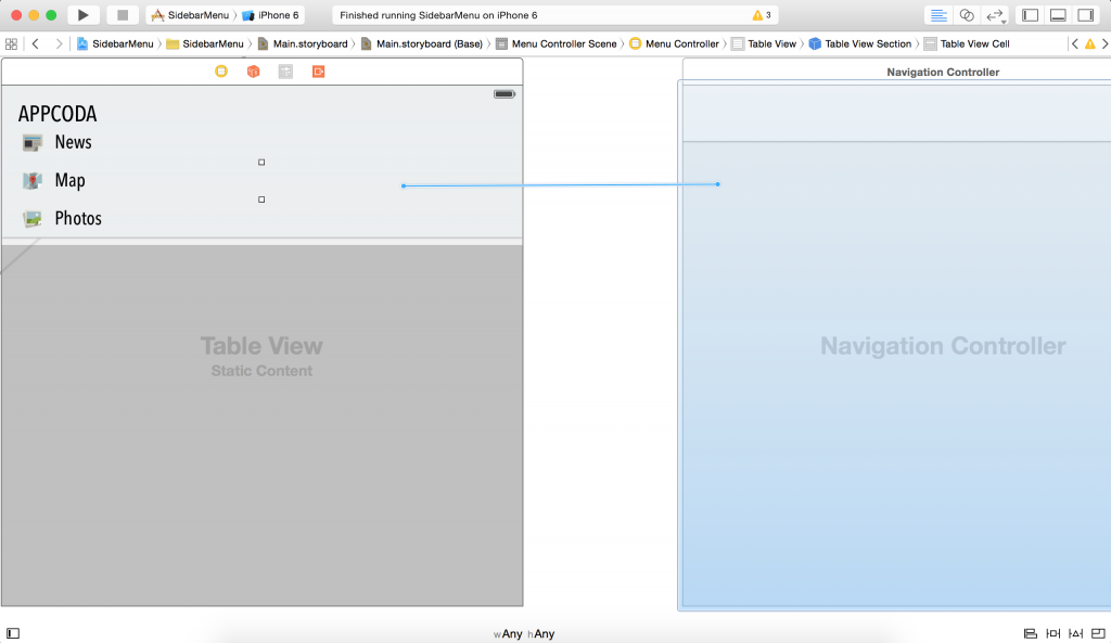到现在为止,我们还没有为菜单栏配置任何 Segue;所以不管你点击哪一个菜单项,App 总是不能切换到相符的那个视图。