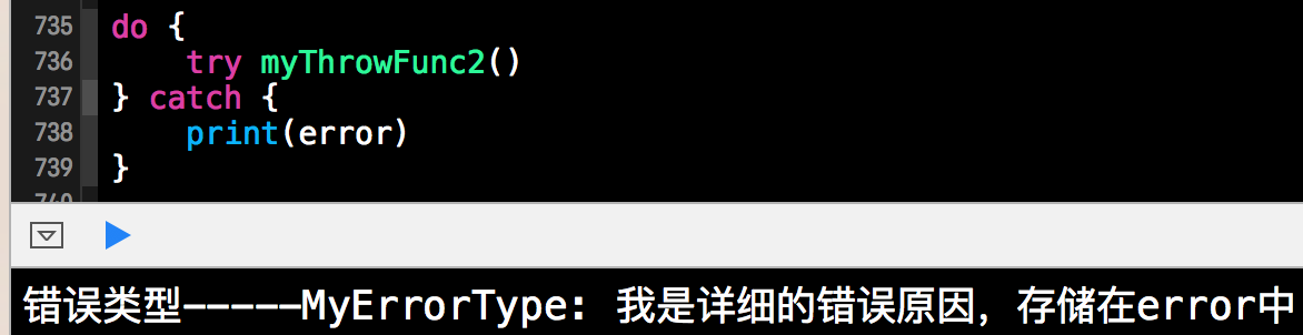 由上面的输出结果可知,error是我们自定义的MyErrorType类型,我们可以使用下面的代码来代替catch中的print语句,如下所示: