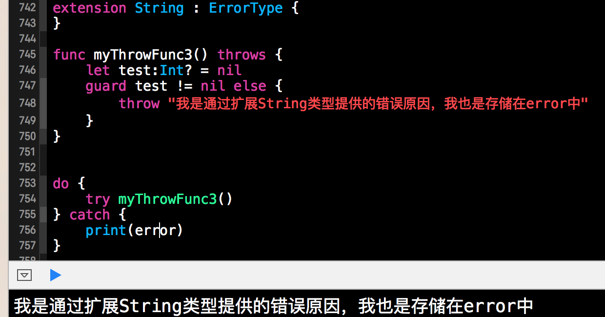 在“2”中,我们使用了结构体遵循ErrorType协议的形式,来为错误提供错误信息的。在接下来的部分,我们将通过更为简单的方式为抛出的错误提供错误信息。这种方式更为简单,也易于理解,具体方式如下方代码所示: