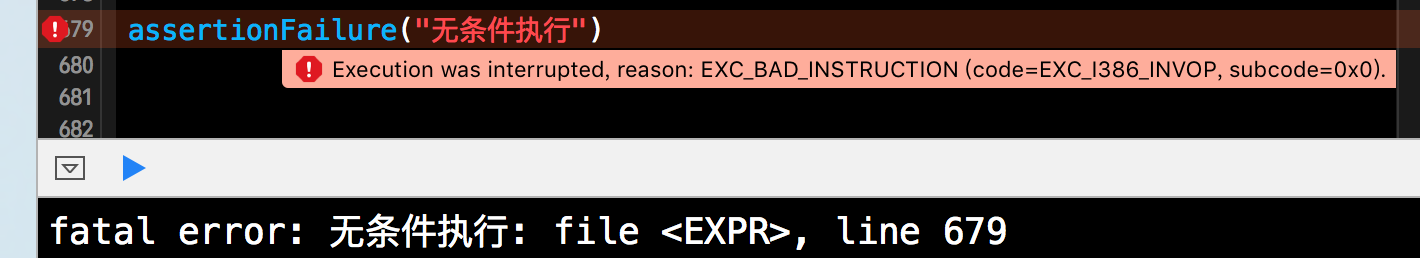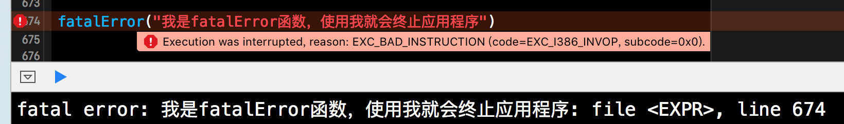 使用fatalError()函数可以立即终止你的应用程序,在fatalError()中可以给出终止信息。使用fatalError()函数,会毫无条件的终止你的应用程序,用起来也是比较简单的,就是一个函数的调用。下方这个Demo一目了然呢,在此就不做过多赘述了。