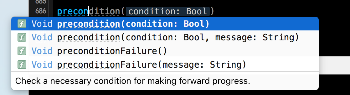 在单元测试中是少不了断言的,Swift中的断言和Objective-C的区别不是太大,使用方法也是大同小异。下方就是断言的两种方法,由代码提示可知,在断言中的提示条件是可选的。断言会在Debug模式下起作用,但是在Release版本中就会被忽略。
