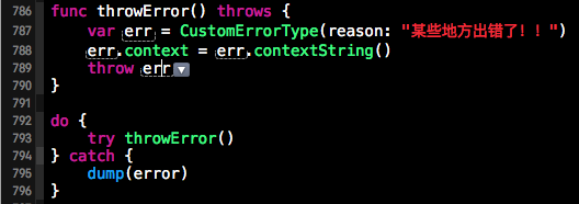 (4)在枚举实现错误类型中我们可以通过值绑定的形式为错误添加错误代码和错误原因。在声明枚举时,我们使用了枚举元素值绑定的特性(关于枚举使用的更多细节请参考之前的博客《窥探Swift之别样的枚举类型》)。在声明枚举成员ErrorState时,我们为其绑定了两个变量,一个是错误代码errorCode, 另一个是错误原因errorReason。这两者可以在抛出错误时为其传入相应的值,如下方代码片段中的throwError函数所示,在抛出错误是为errorCode指定的错误代码为404,为errorReason指定的错误原因是“not found”。