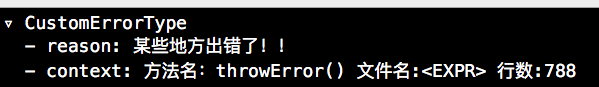经过上述步骤如果你在Playground中进行试验的,那么在控制台上你将会看到如下信息。从打印出的信息我们可以看到,信息包括reason:错误原因,和context:异常上下文。在下方的输出结果中,文件名我们可以看到是<EXPR>这并不是确切的文件名,因为我们是在Playground中使用的,并且不是确切的Swift源文件,所以获取不到确切的文件名。