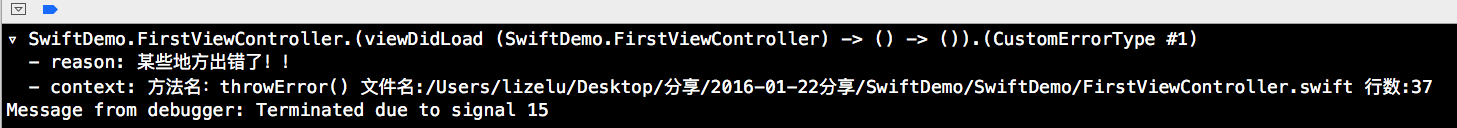 为了观察确切的文件名,我们需要在确切的Swift源文件中抛出上述异常。在特定Swift源文件中,我们会看到下方的输出结果。从下方的输出日志中,我们可以清楚的看到文件名是一个详细的文件路径。如下所示: