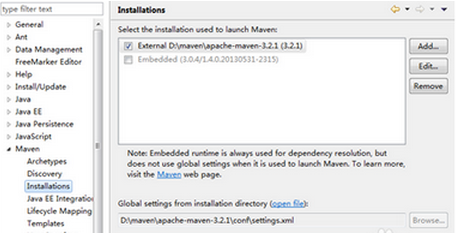从Eclipse的菜单栏点击Windows -> Preferences -> Maven? -> Installations,将之前解压的maven添加进来,如图所示