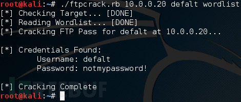 现在,我们根据该脚本的使用规则提供相应的参数值,并执行脚本。经过一段时间的等待,我们可以看到FTP服务器密码被成功爆破: